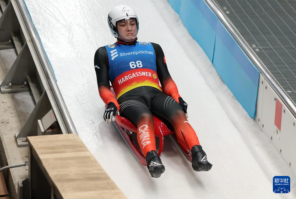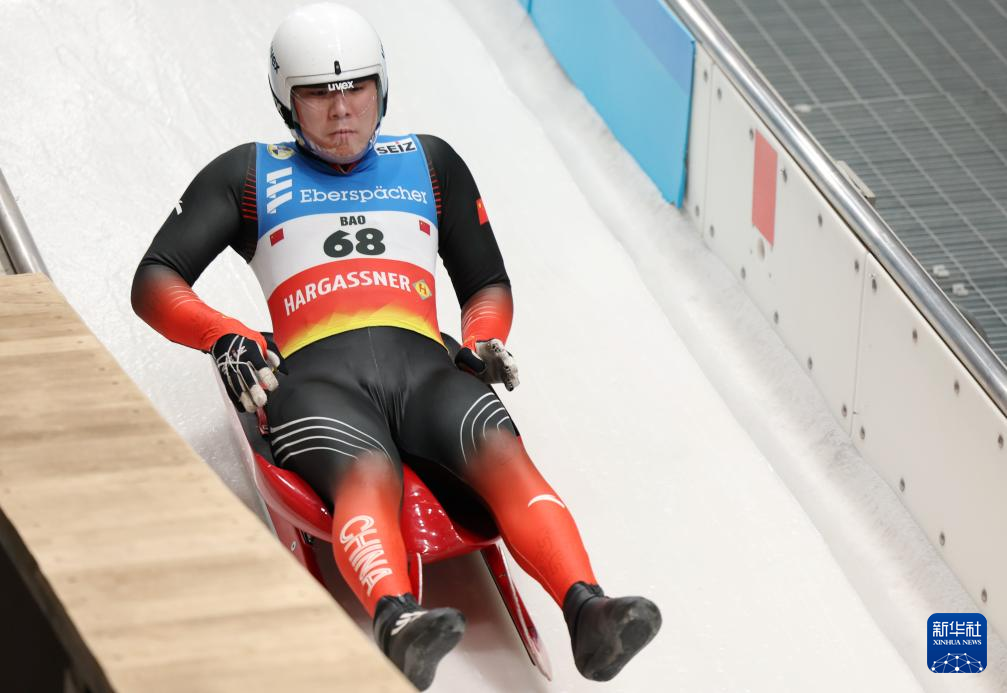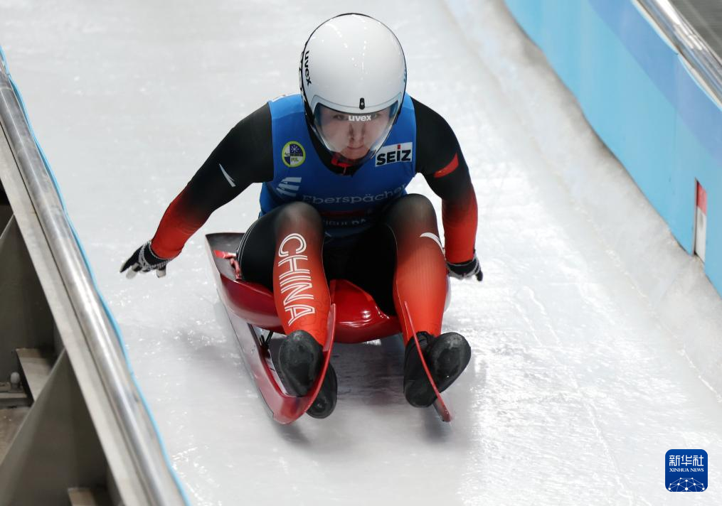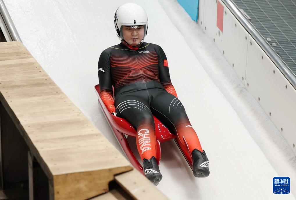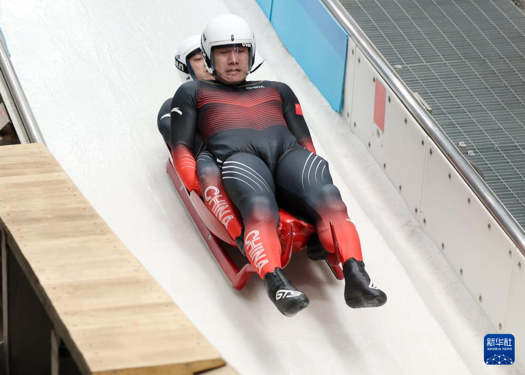 12月17日,黄叶波/彭俊越在比赛中出发。当日,第十四届全国冬季运动会团体接力雪橇项目比赛在国家雪车雪橇中心进行。新华社记者 张晨霖 摄