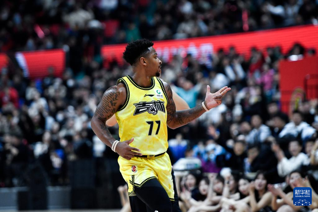 1月5日,吉林九台农商银行队球员皮特森庆祝进球。新华社记者 许畅 摄