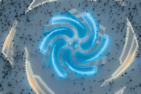 ↑2019年1月25日,在内蒙古自治区多伦县举行的十四冬冰上龙舟项目测试赛上,选手在奋力前行(无人机拍摄)。新华社记者邹予摄