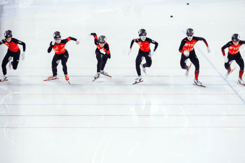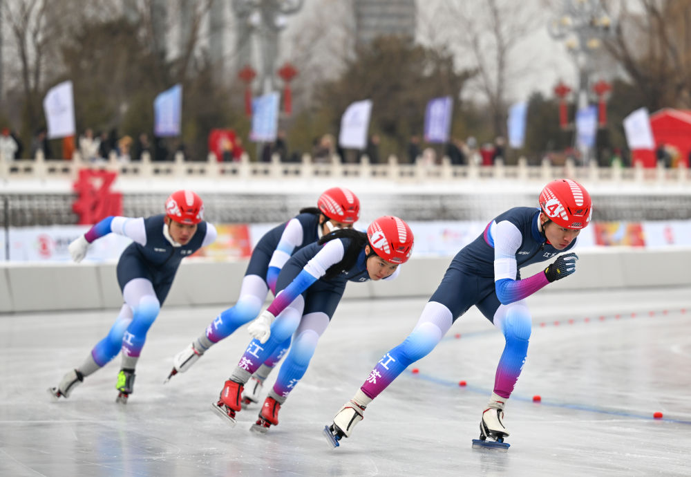 ↑2024年1月13日,江苏队选手在内蒙古呼和浩特市举行的十四冬群众速度滑冰比赛2000米混合团体赛中。新华社记者 贝赫 摄