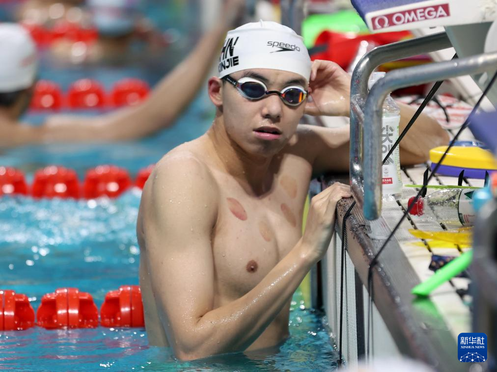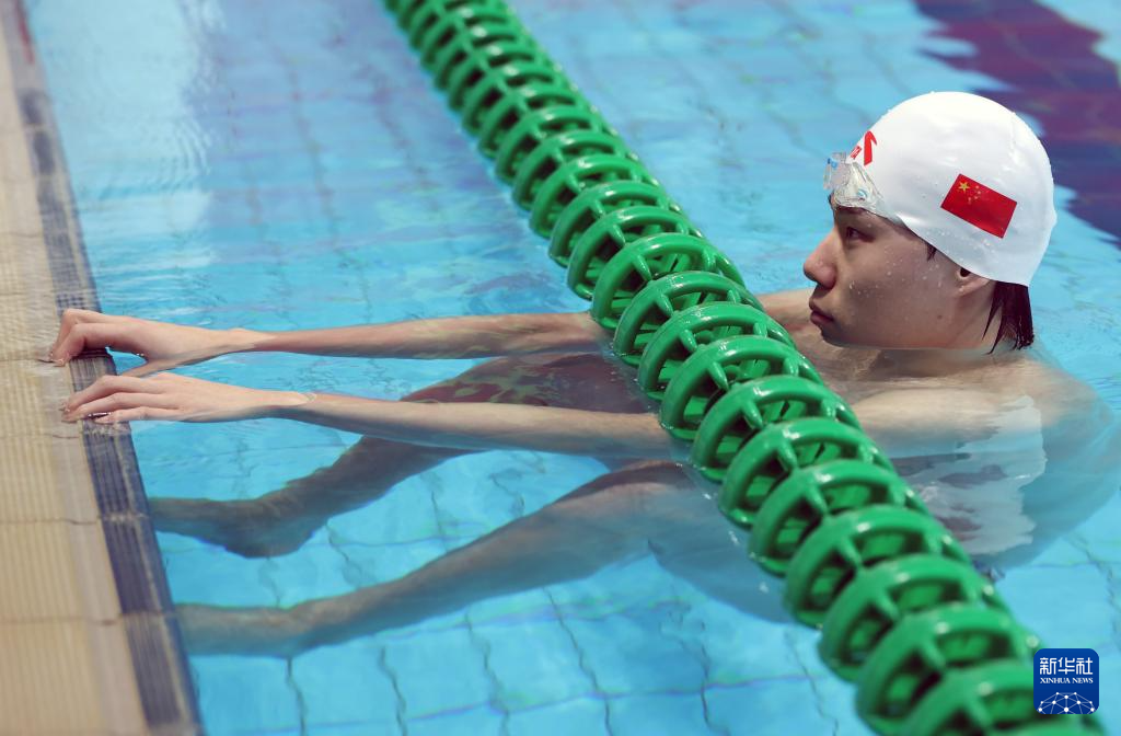 1月25日,中国游泳队队员覃海洋在训练间隙。新华社记者 雒圆 摄