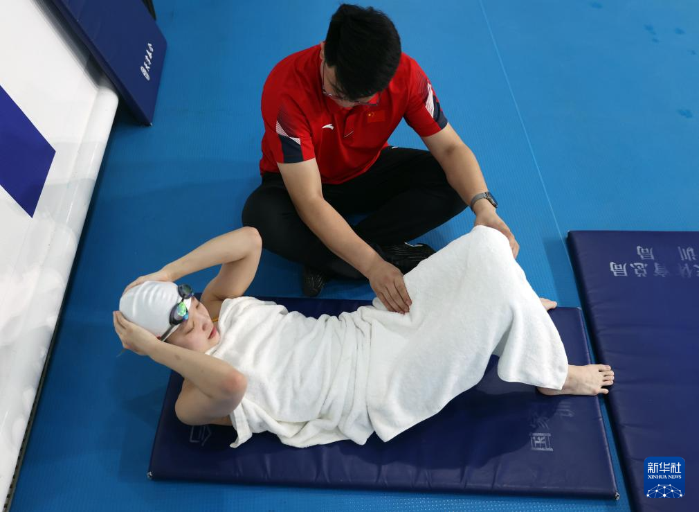 1月25日,中国游泳队队员马永慧(下)在训练后接受按摩。新华社记者 雒圆 摄