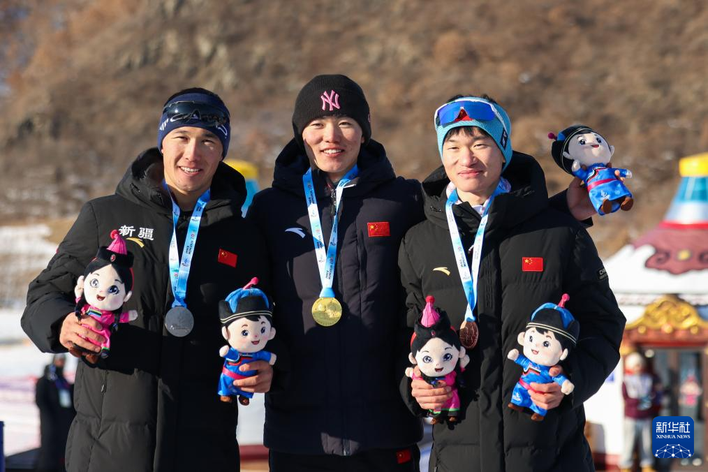 1月30日,冠军吉林选手张成浩(中)、亚军新疆选手依斯马尔·托合塔尔艾力(左)、季军山东选手刘建宾在颁奖仪式上合影。新华社记者 王楷焱 摄