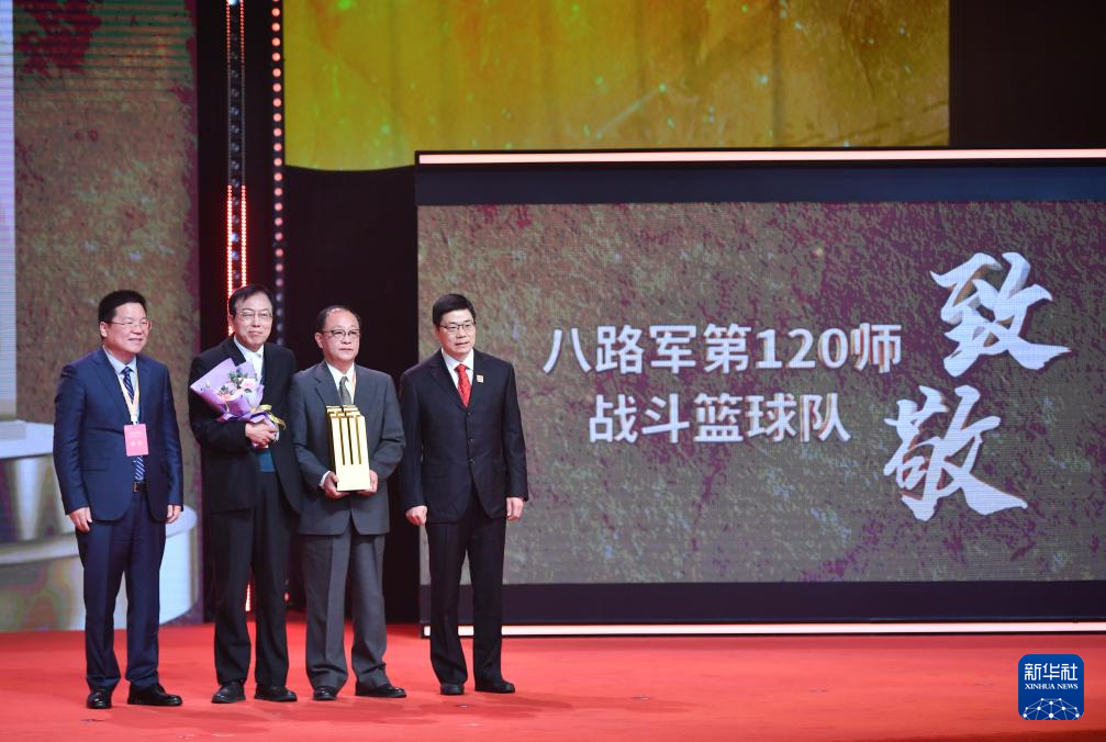 2月4日,2023年中国篮球名人堂“特别致敬集体”、八路军第120师战斗篮球队后人代表在仪式上接受鲜花和奖杯。新华社记者 张博文 摄