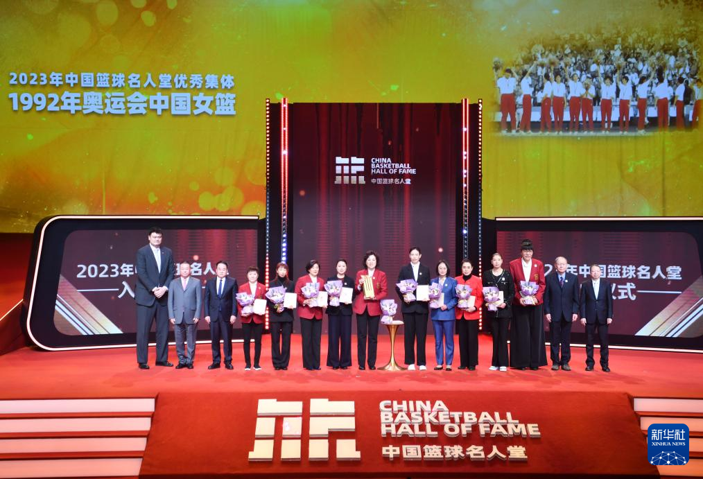 2月4日,中国篮球协会主席姚明(左一)与2023年中国篮球名人堂优秀集体、1992年奥运会中国女篮成员及颁奖嘉宾在仪式上合影。新华社记者 张博文 摄
