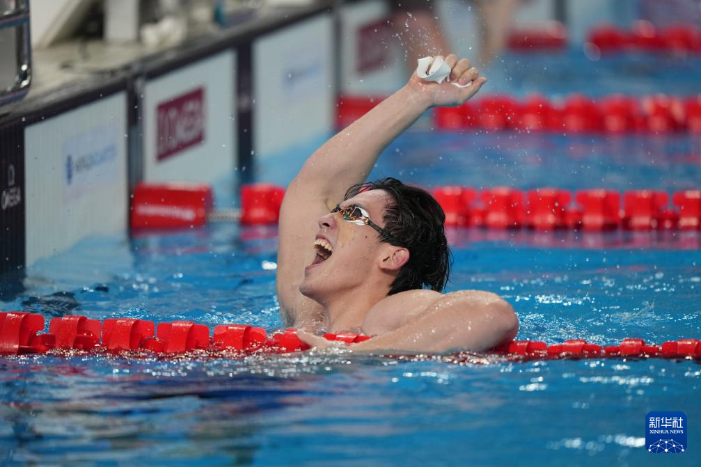 2月11日,中国队选手潘展乐庆祝。新华社记者 薛宇舸 摄