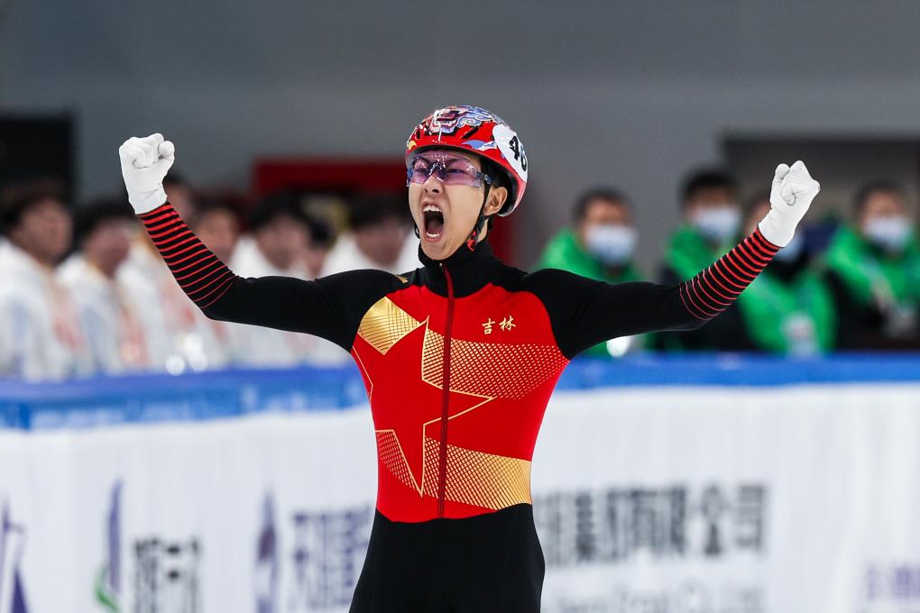 2月16日,吉林队选手孙龙冲线后庆祝胜利。新华社记者 李博 摄