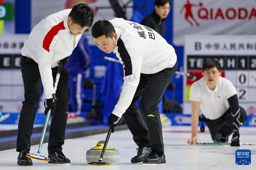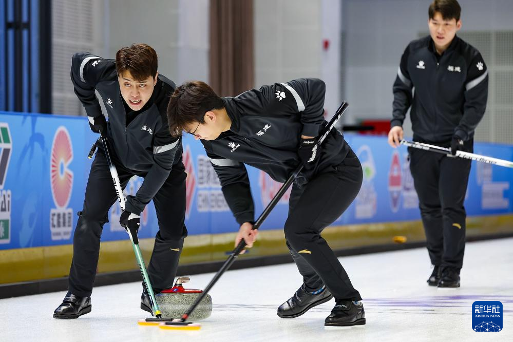 2月22日,福建队选手姜东旭(左一)、苑明杰(左二)、王智宇在比赛中。最终,福建队8比11不敌河北队。新华社记者 姜帆 摄