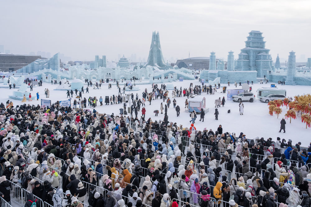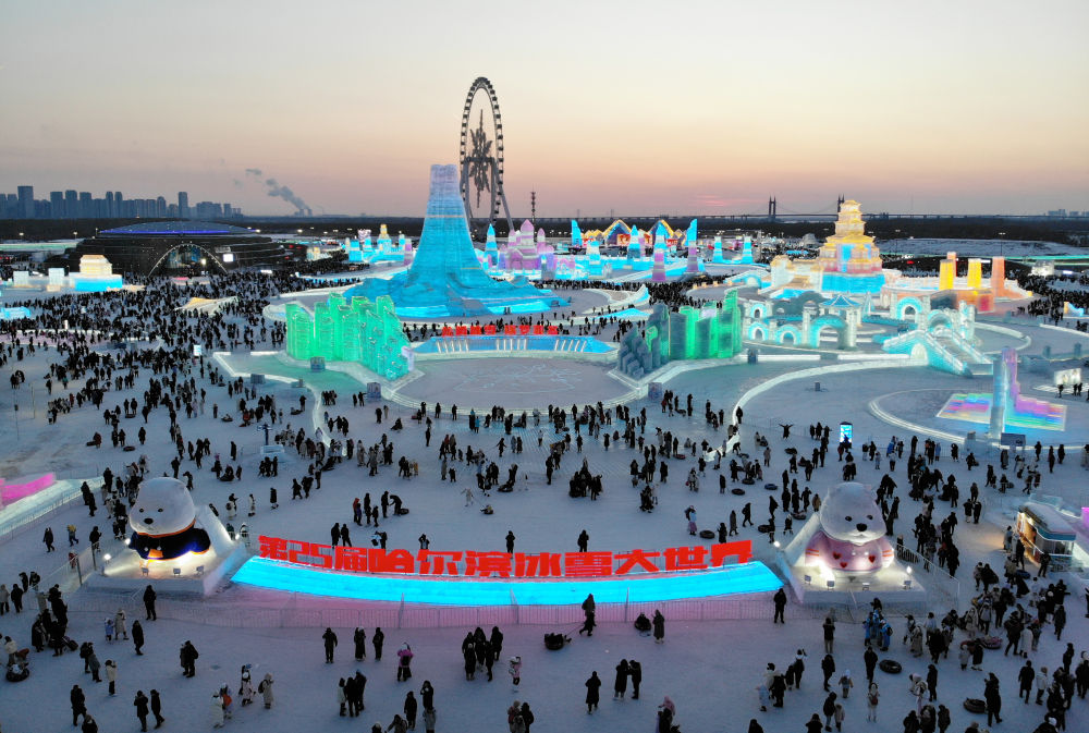2024年2月15日,游客在哈尔滨冰雪大世界园区内游玩(无人机照片)。