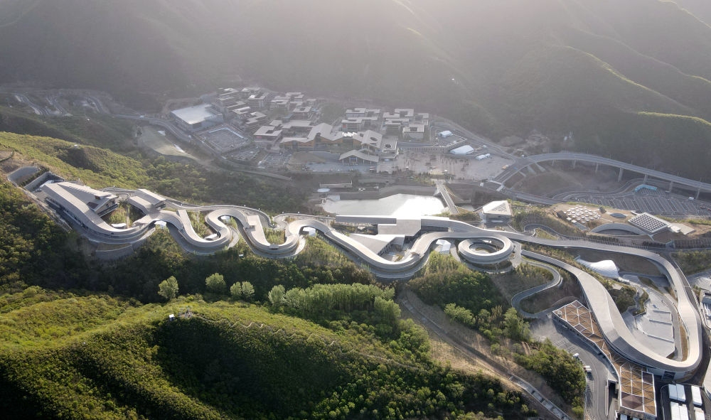 这是2022年4月26日拍摄的国家雪车雪橇中心(下)和冬奥村(上)(无人机照片)。北京延庆奥林匹克园区在向公众开放期间,保留冬奥会和冬残奥会景观元素,游客可乘坐索道俯瞰海陀山景,也可实地参观国家高山滑雪中心“雪飞燕”、国家雪车雪橇中心“雪游龙”,体验冬奥村运动员餐厅、住宿,感受冬奥会、冬残奥会的赛时氛围。