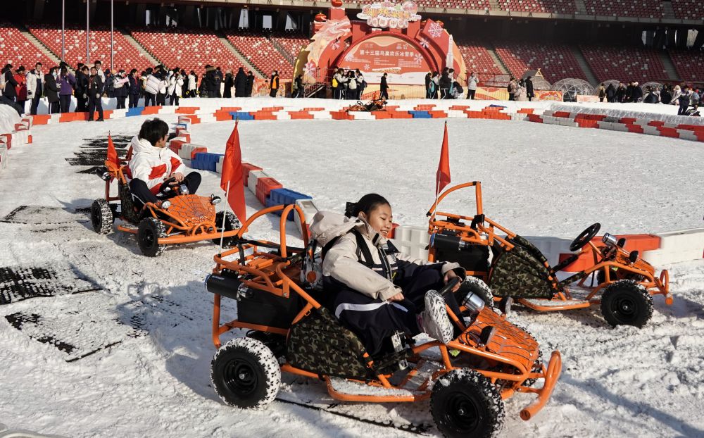 2023年12月29日,学生们在“鸟巢”欢乐冰雪季上玩耍。国家体育场“鸟巢”欢乐冰雪季以“龙咚锵 中国年”为主题,活动总面积达6万余平方米,设置了超级冰滑梯、雪圈广场、雪地卡丁车等游乐项目。