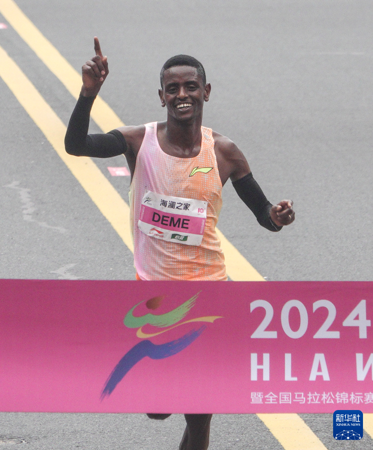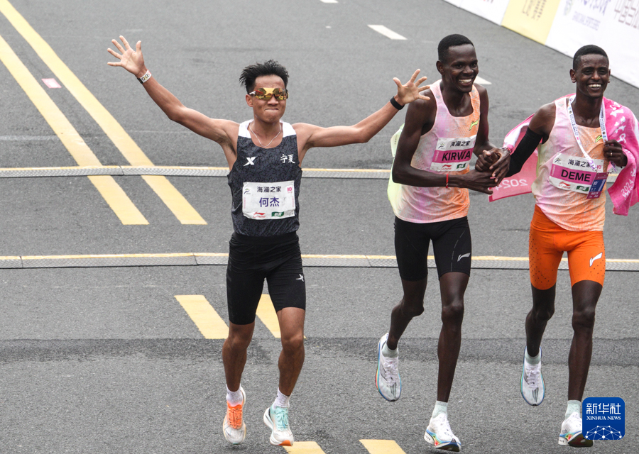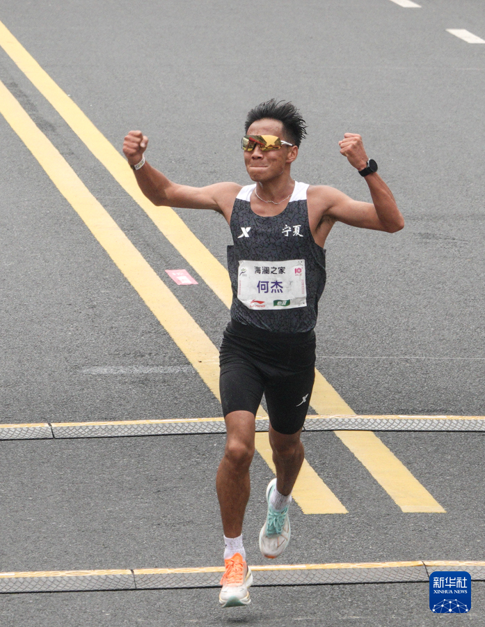 3月24日,何杰在比赛中冲线。最终,他以2小时06分57秒的成绩获得全国马拉松锦标赛(第一站)男子组冠军并创造了新的全国纪录。新华社记者 杨磊 摄