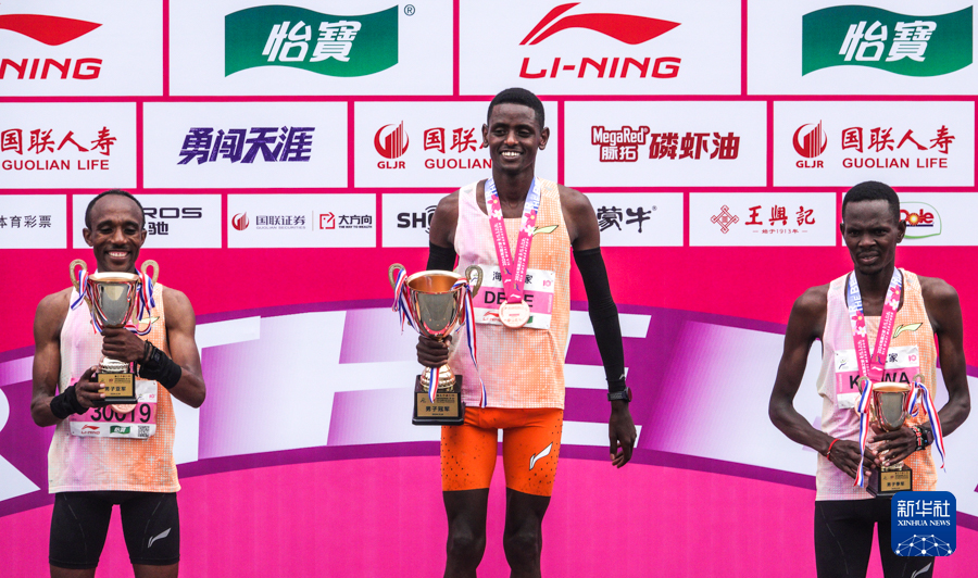 3月24日,冠军埃塞俄比亚选手塔度·阿巴特·蒂姆(中)、亚军埃塞俄比亚选手阿拜·阿莱穆·莱萨(左)和季军肯尼亚选手尼古拉斯·基鲁瓦在2024无锡马拉松男子组颁奖仪式上。新华社记者 杨磊 摄