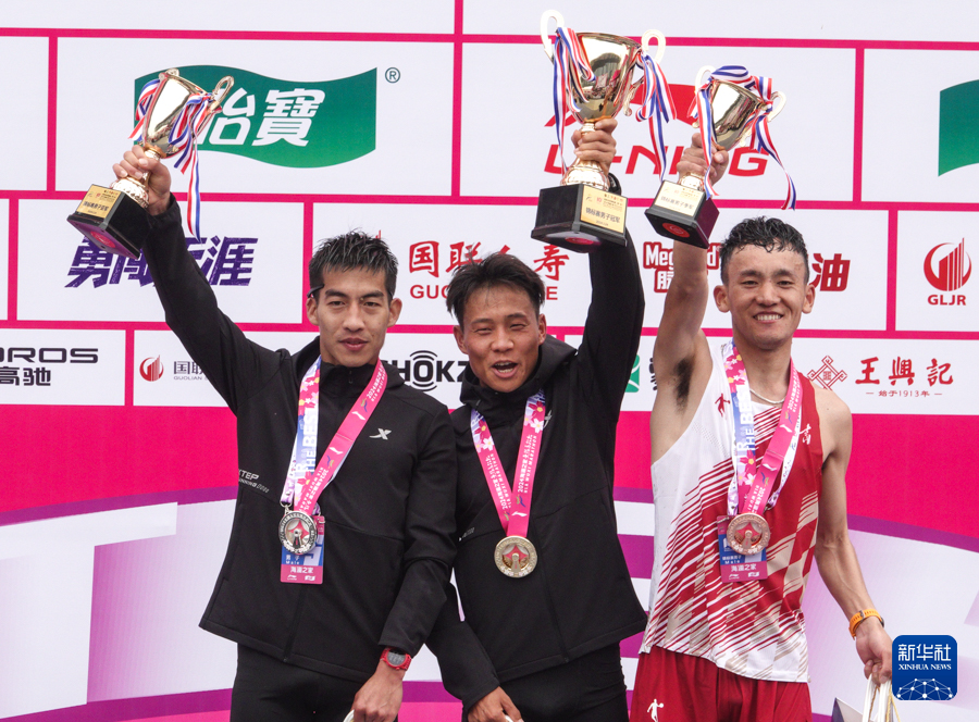 3月24日,冠军何杰(中)、亚军杨绍辉(左)和季军桑吉东知在全国马拉松锦标赛(第一站)男子组颁奖仪式上。新华社记者 杨磊 摄