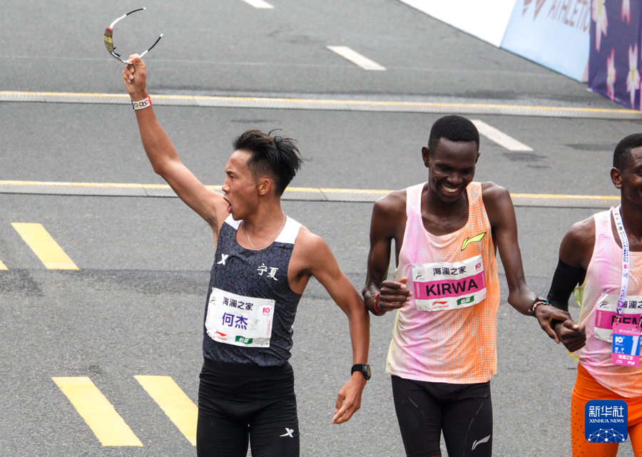 3月24日,何杰(左)在比赛后庆祝。最终,他以2小时06分57秒的成绩获得全国马拉松锦标赛(第一站)男子组冠军并创造了新的全国纪录。新华社记者 杨磊 摄