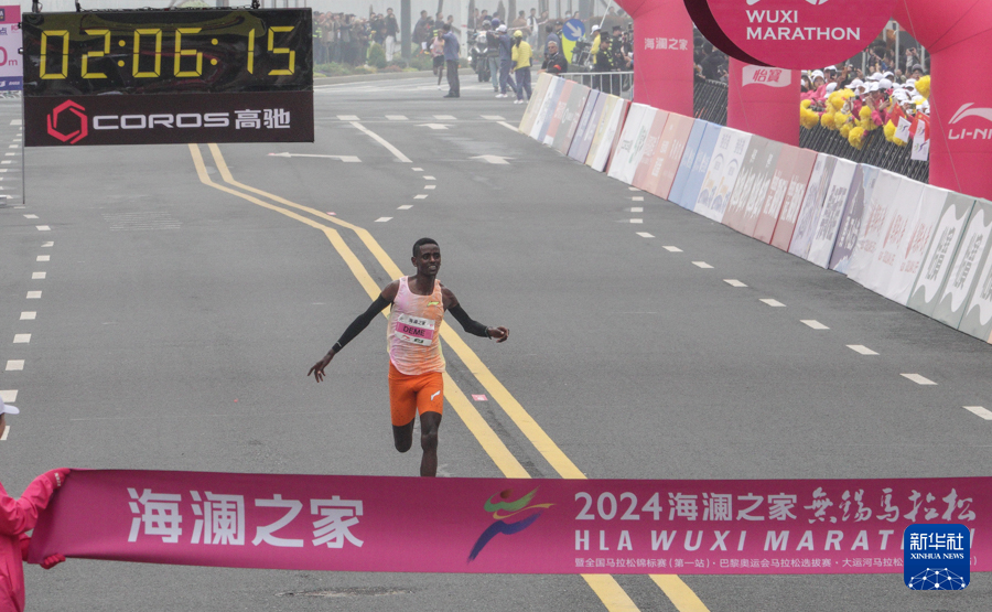 3月24日,埃塞俄比亚选手塔度·阿巴特·蒂姆在比赛中冲线。最终,他以2小时06分18秒的成绩获得2024无锡马拉松男子组冠军。新华社记者 杨磊 摄