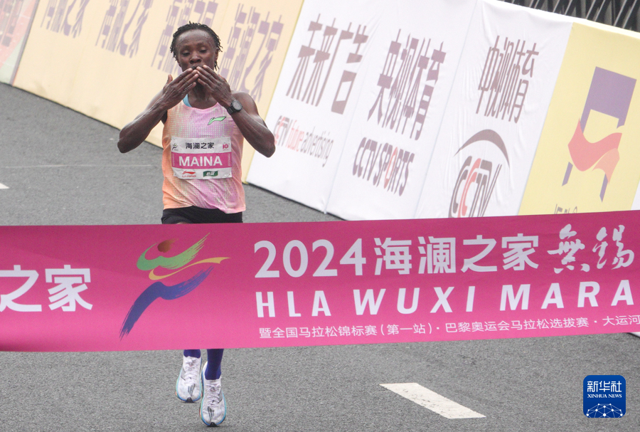 3月24日,肯尼亚选手维罗妮卡·恩杰里·马伊纳比赛中冲线。最终,她以2小时24分46秒的成绩获得2024无锡马拉松女子组冠军。新华社记者 杨磊 摄
