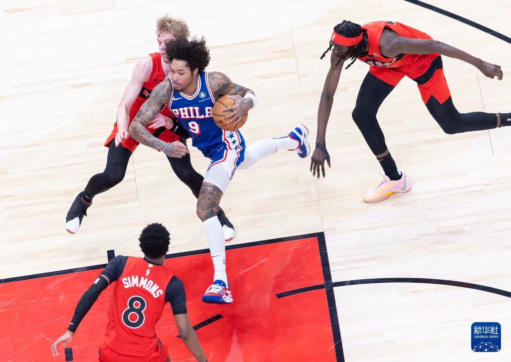 3月31日,76人队球员佩恩(右)与猛龙队球员弗里曼-利伯蒂在比赛中拼抢。新华社发(邹峥摄)