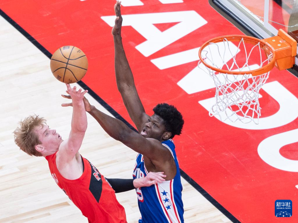 3月31日,76人队球员哈里斯(右)在比赛中封盖猛龙队球员弗里曼-利伯蒂的上篮。新华社发(邹峥摄)