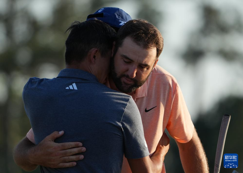 4月14日,美国选手斯科蒂·舍夫勒(右)在获得冠军后庆祝。新华社记者 吴晓凌 摄