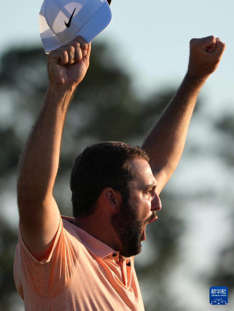 4月14日,美国选手斯科蒂·舍夫勒在获得冠军后庆祝。新华社记者 吴晓凌 摄