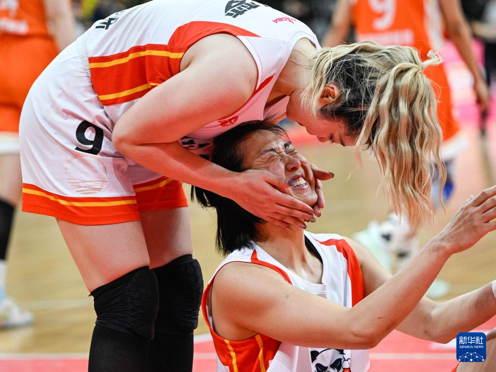 4月16日,四川远达美乐队球员王思雨(前)在比赛中庆祝得分。新华社记者 王曦 摄