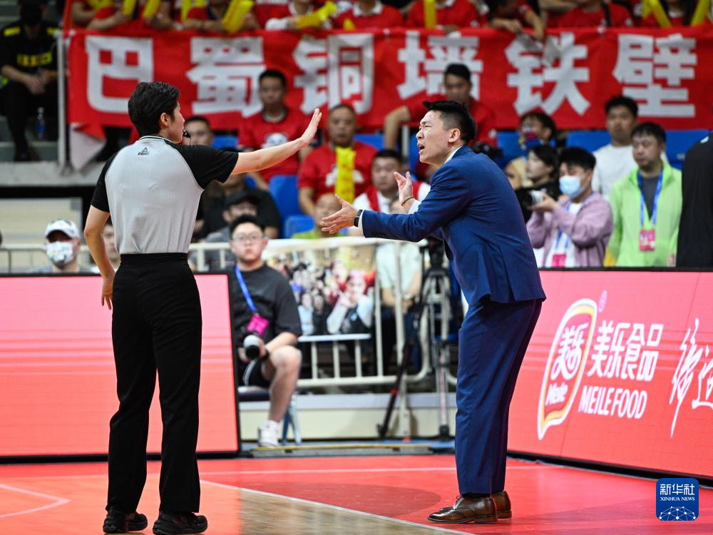 4月16日,内蒙古农信队主教练杨赞(右)在比赛中和裁判交流。新华社记者 王曦 摄