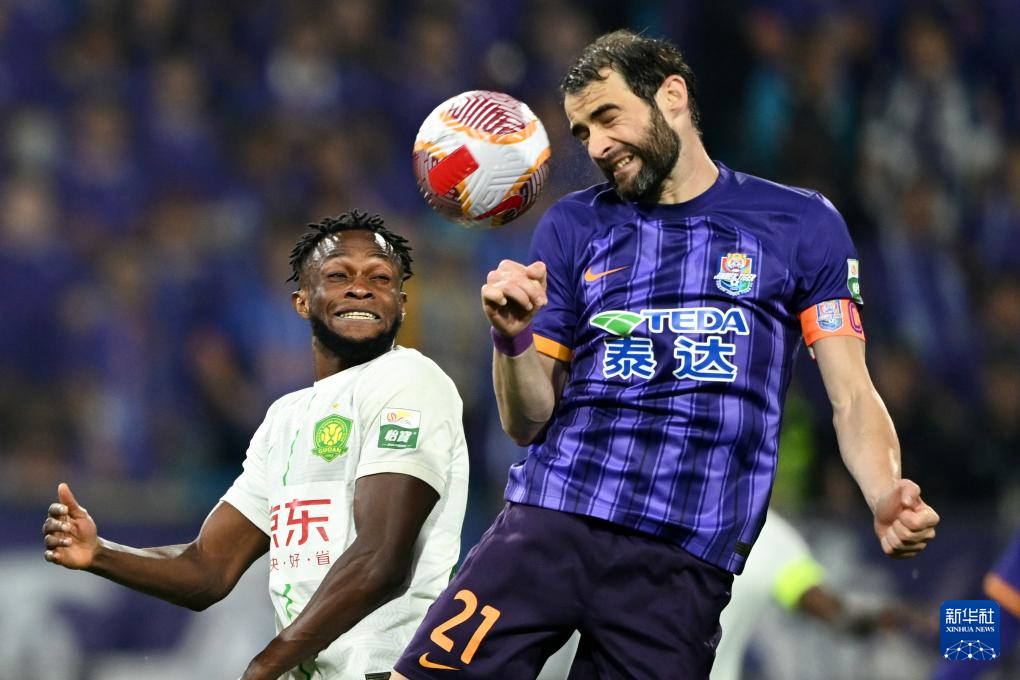4月30日,天津津门虎队球员什科里奇(右)和北京国安队球员阿德本罗在比赛中争顶。新华社记者 赵子硕 摄