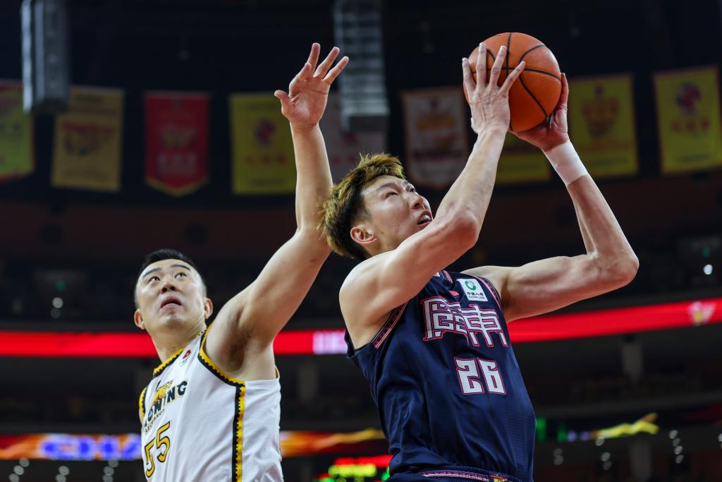 5月6日,广东队球员周琦(右)在比赛中上篮。新华社发(郑家雄摄)