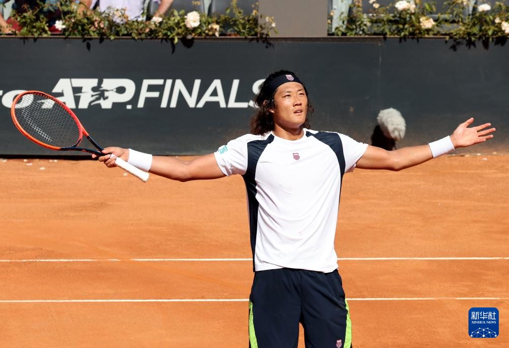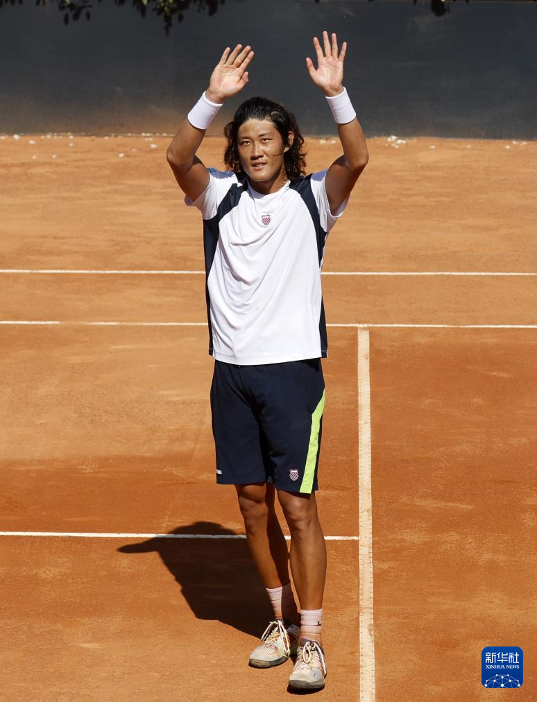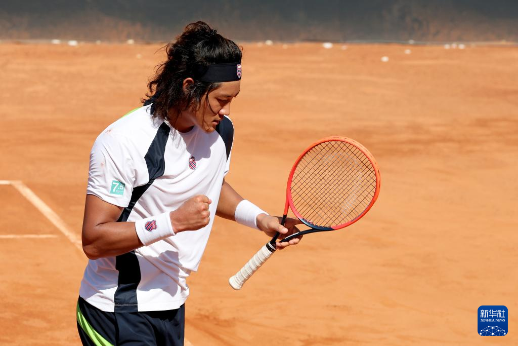 5月14日,张之臻庆祝得分。新华社发(阿尔贝托·林格利亚摄)