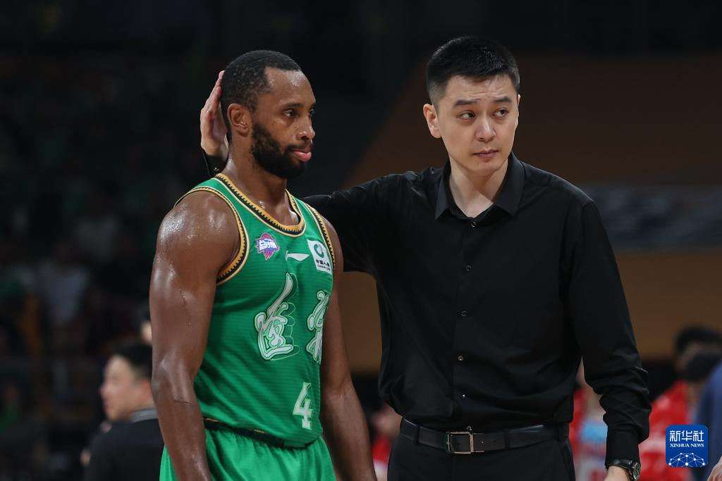 5月17日,辽宁本钢队主教练杨鸣(右)在比赛中鼓励球员弗格。
