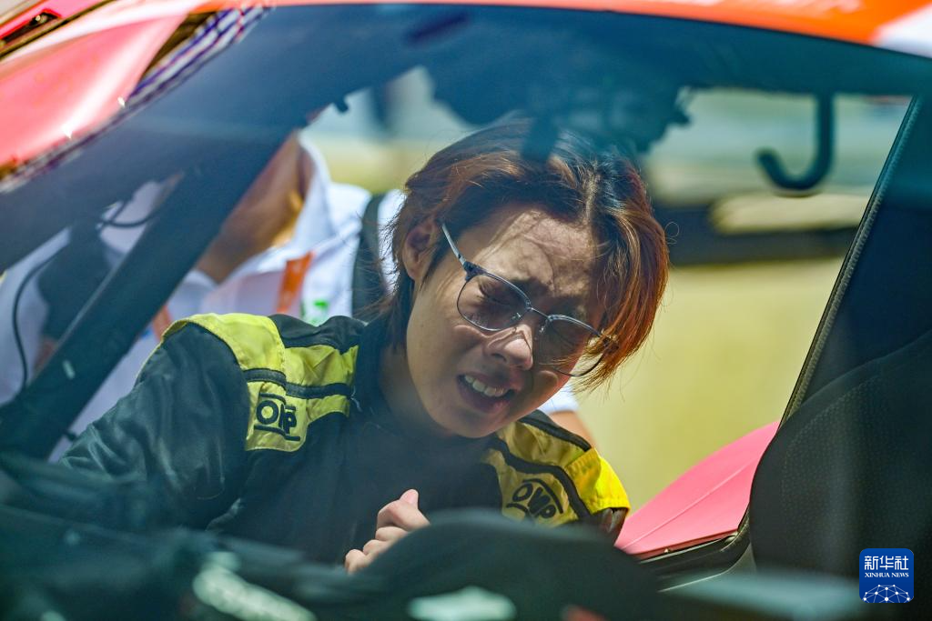 5月22日,河北迁安九江汽摩运动俱乐部领航员马欣在抵达赛段终点后。新华社记者 陈朔 摄