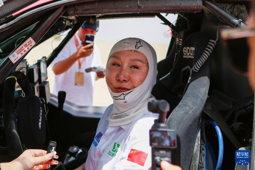 5月22日,河北迁安九江汽摩运动俱乐部车手孙相燕在抵达赛段终点后接受采访。新华社记者 陈朔 摄