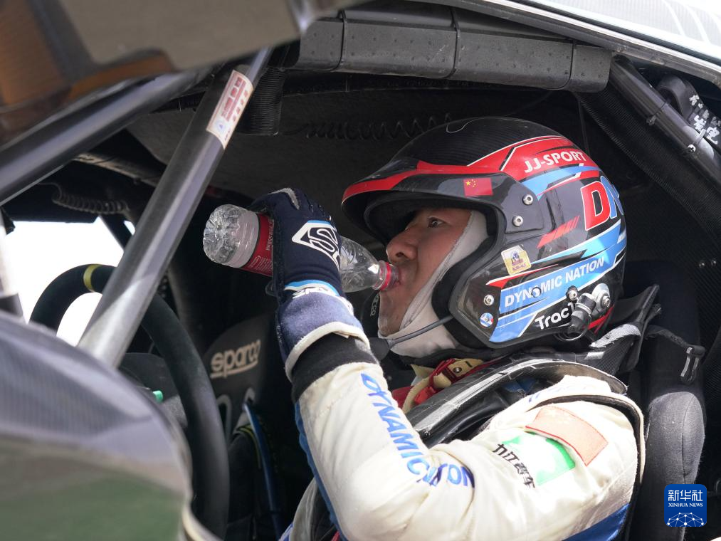 5月22日,河北迁安九江汽摩运动俱乐部车手范高翔在抵达赛段终点后补充水分。新华社记者 张啸诚 摄