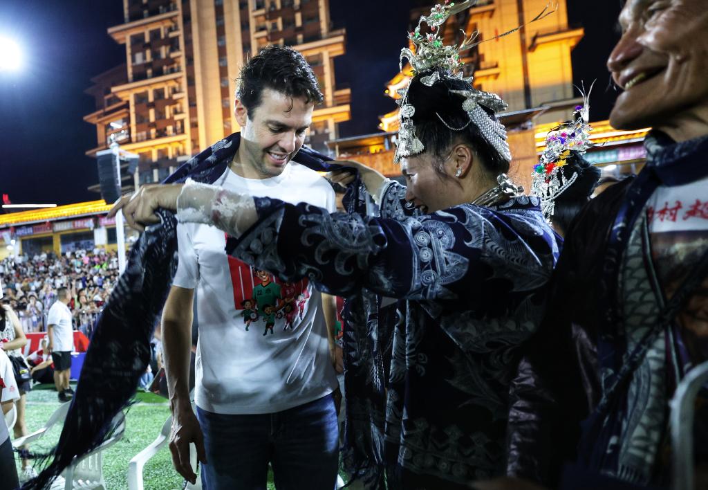 新华社贵阳5月28日电(记者周宣妮、罗羽、吴思)回忆起27日晚上与国际足球巨星卡卡的见面,89岁高龄的“村超爷爷”杨老赶难掩激动的神色,“我们在球场边见到了卡卡,并且准备了一套礼物送给他,包括摆贝的苗族蜡染围巾和外套。”杨老赶说。