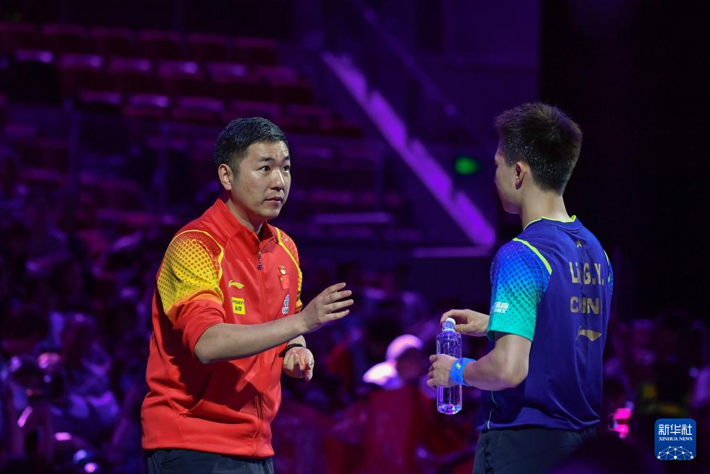 5月31日,林高远(右)与教练刘恒在比赛间隙交流。