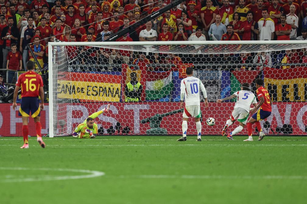 意大利队的丢球其实多少有些倒霉。第55分钟,西班牙球员尼科·威廉姆斯左路连续突破后送出传中,莫拉塔在前点一蹭,意大利队门将唐纳鲁马奋力一扑,但皮球正好打在回防的卡拉菲奥里身上弹进球门。