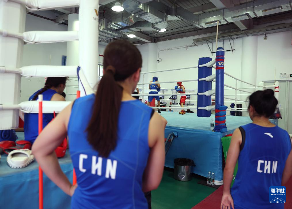 6月29日,来自河北省拳击队的队员刘家绮(右二)与赵硕宇(右一)在场地旁热身。随后,她们作为对手与国家拳击队队员进行实战训练。新华社记者 贾浩成 摄