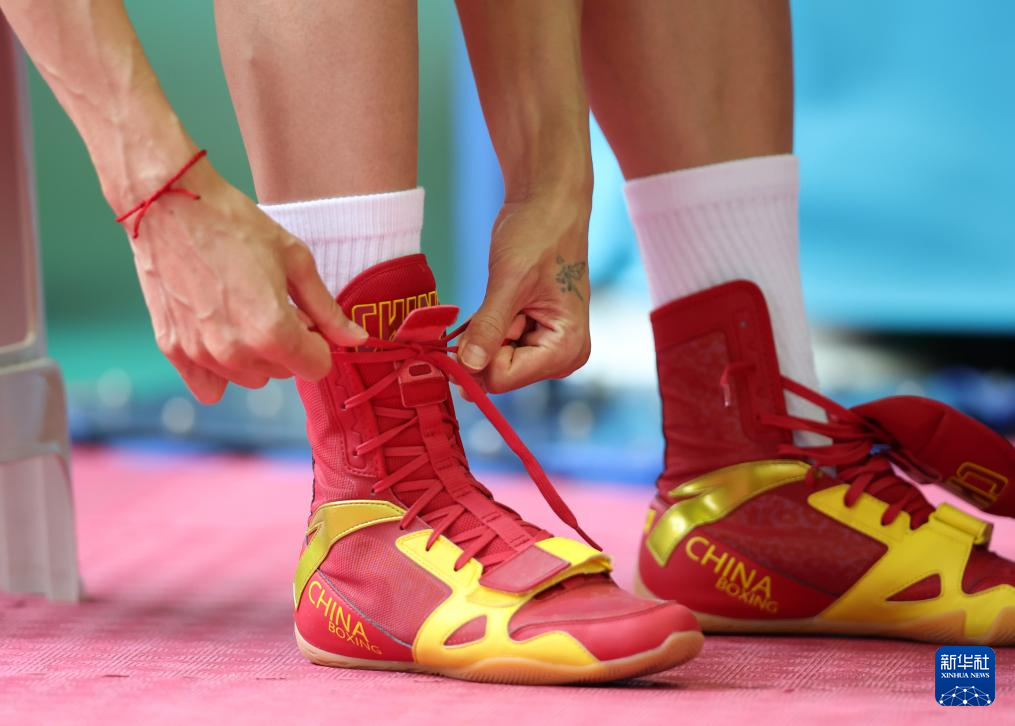 6月29日,国家拳击队队员杨柳在训练前绑紧鞋带。新华社记者 贾浩成 摄