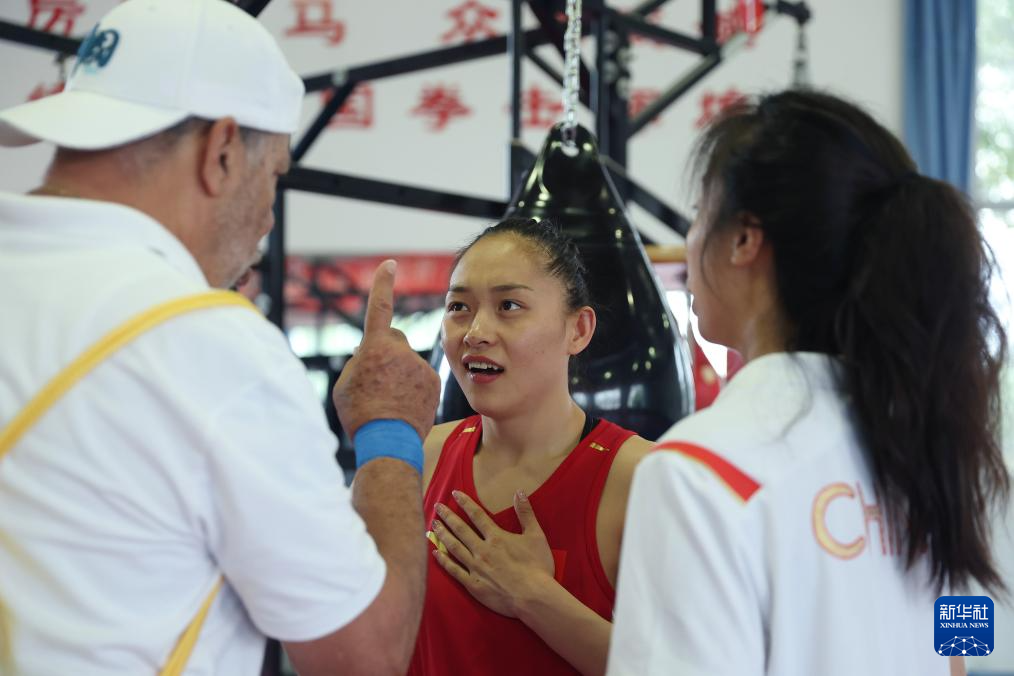 6月29日,国家拳击队队员常园(中)在实战训练后与外籍教练员交流。新华社记者 贾浩成 摄