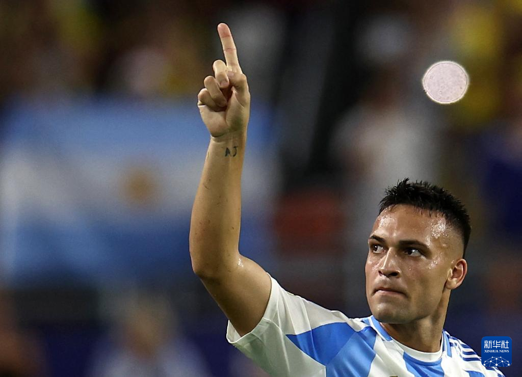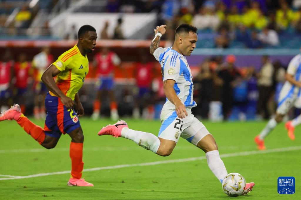 7月14日,阿根廷队球员劳塔罗·马丁内斯(右)在比赛中射门得分。新华社/路透