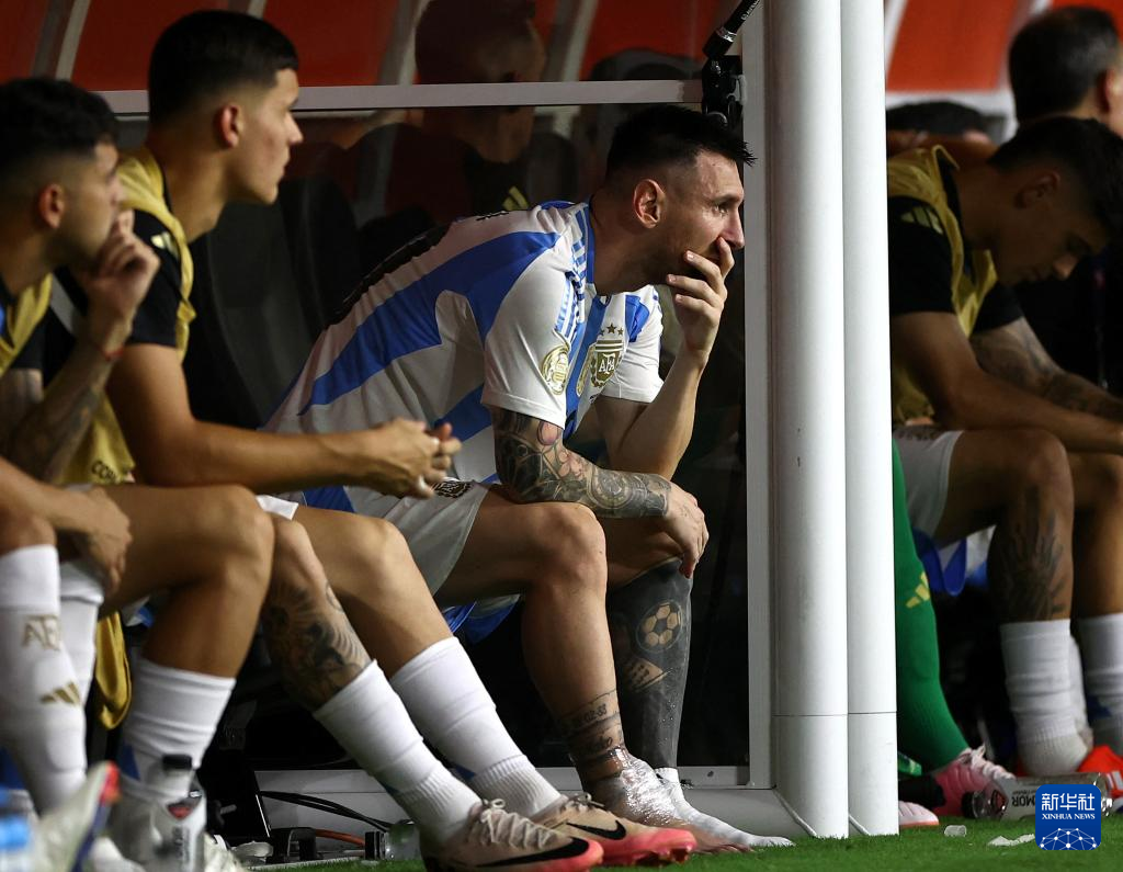 7月14日,因受伤被替换下场的阿根廷队球员梅西在场边观赛。新华社/路透