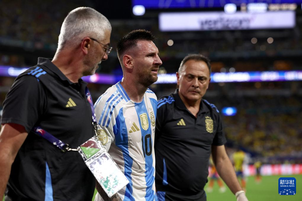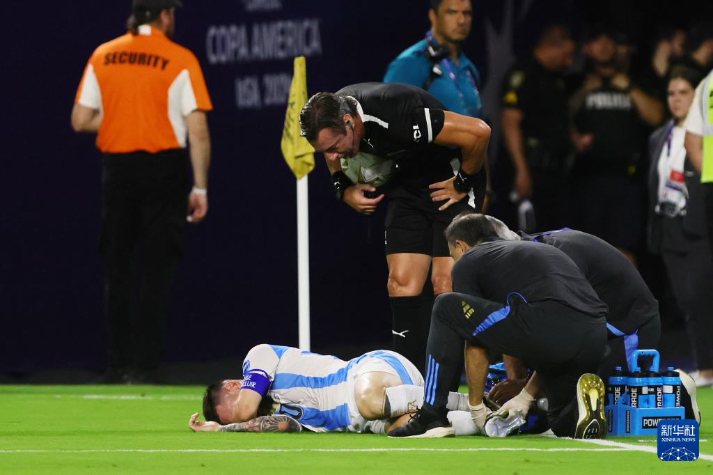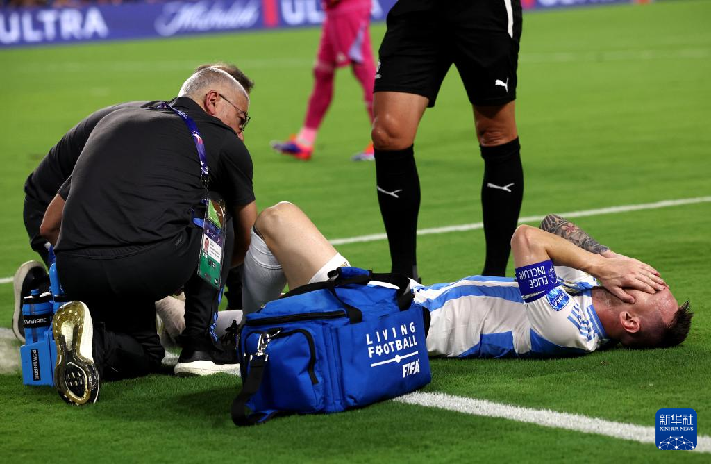 7月14日,阿根廷队球员梅西在比赛中受伤后接受治疗,随后被替换下场。新华社/路透