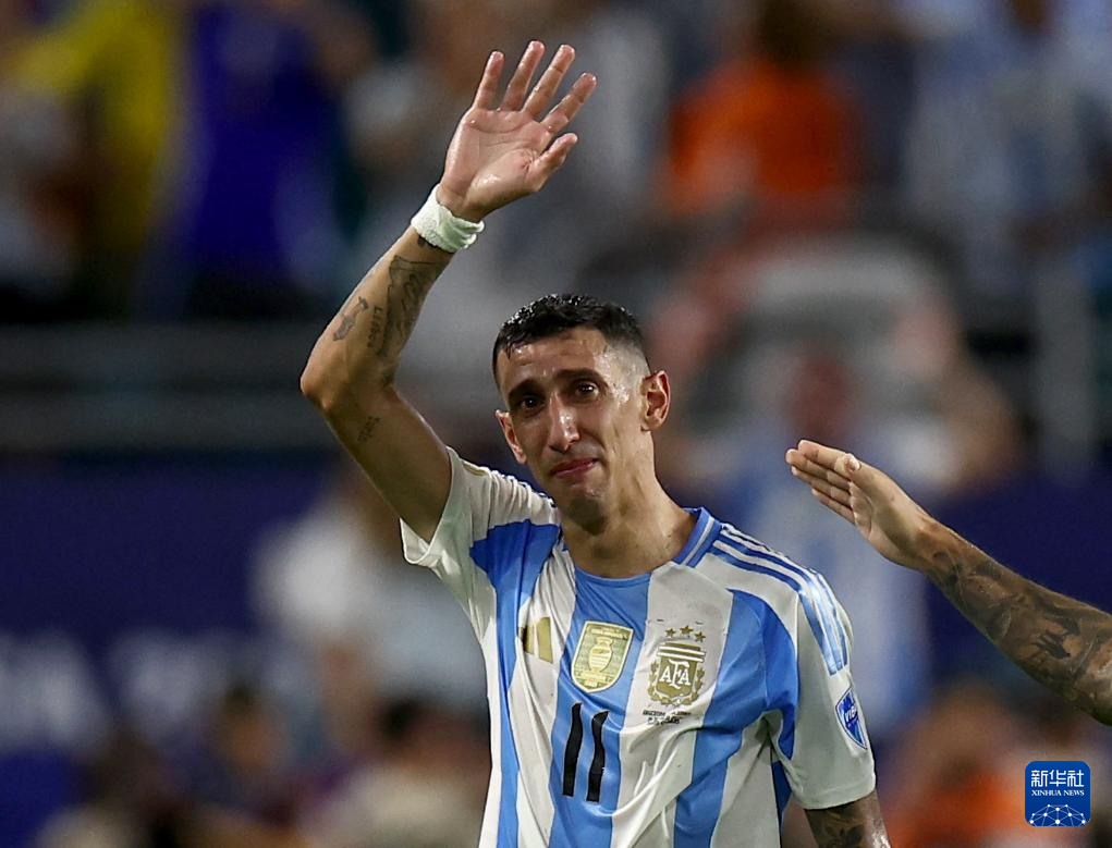 7月14日,阿根廷队球员迪马利亚被替换下场后向球迷挥手致意。新华社/路透