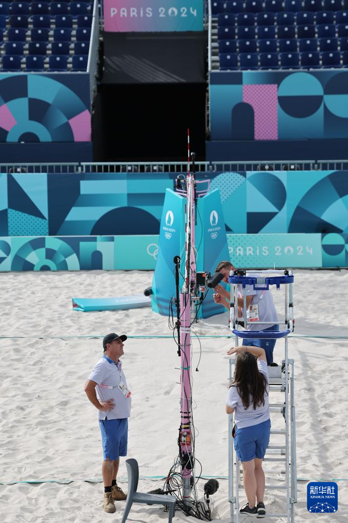 7月25日,工作人员在埃菲尔铁塔体育场布置场地、调试设备。新华社记者 黄宗治 摄