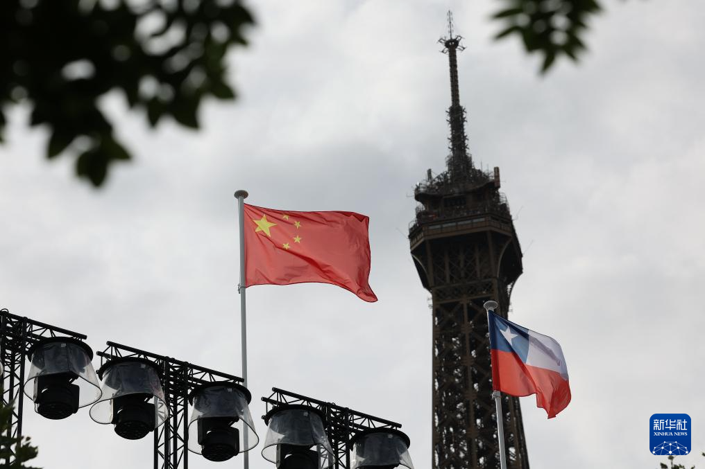 7月25日,中国国旗在埃菲尔铁塔体育场飘扬。中国组合薛晨/夏欣怡将参加女子组比赛。新华社记者 黄宗治 摄