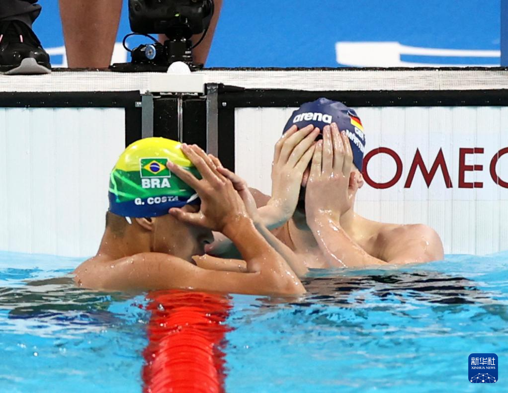 7月27日,德国选手梅尔滕斯(右)庆祝夺冠,巴西选手科斯塔在比赛后懊恼。新华社记者 雒圆 摄