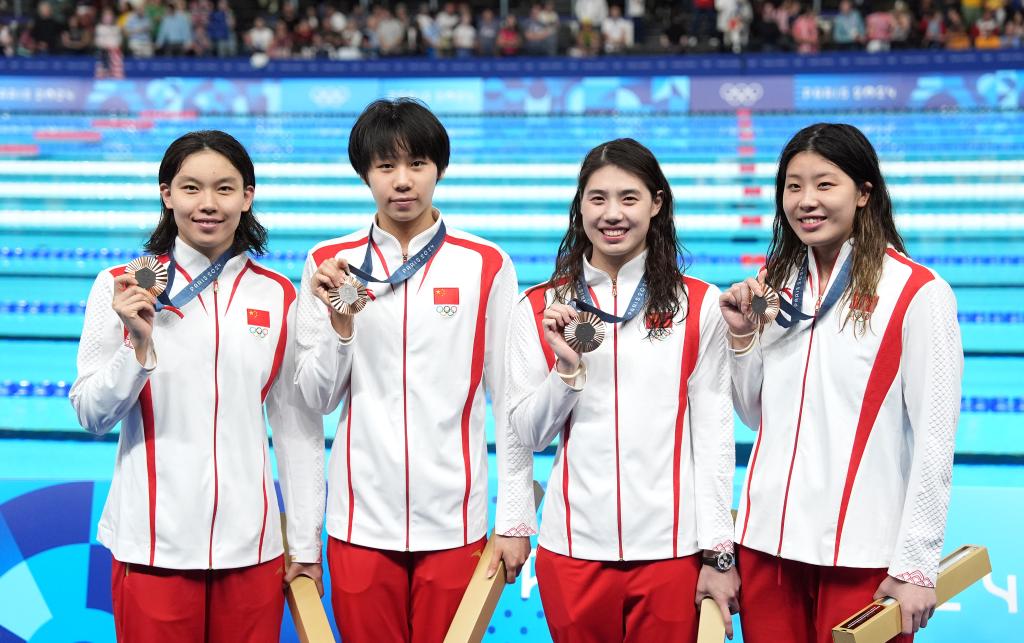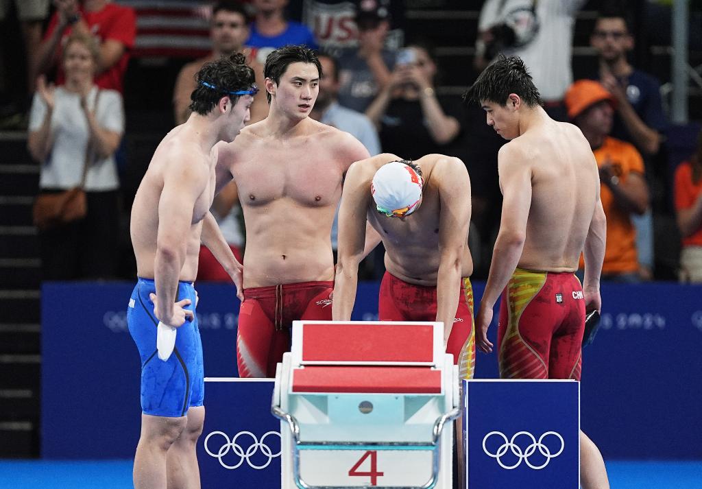 男子4X100米自由泳接力预赛中,中国队以第一名(3分11秒62)晋级决赛。这是中国队首次在该项目闯入奥运会决赛。决赛中,由潘展乐、季新杰、陈俊儿、王浩宇组成的中国队在前三棒保持在前三名的位置,之后被意大利队反超,最终以3分11秒28名列第四,与奖牌遗憾擦肩。美国队以3分09秒28摘金,澳大利亚队和意大利队分获银牌和铜牌。