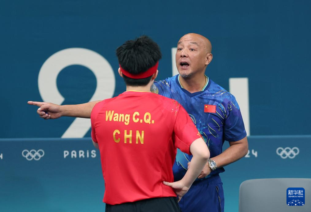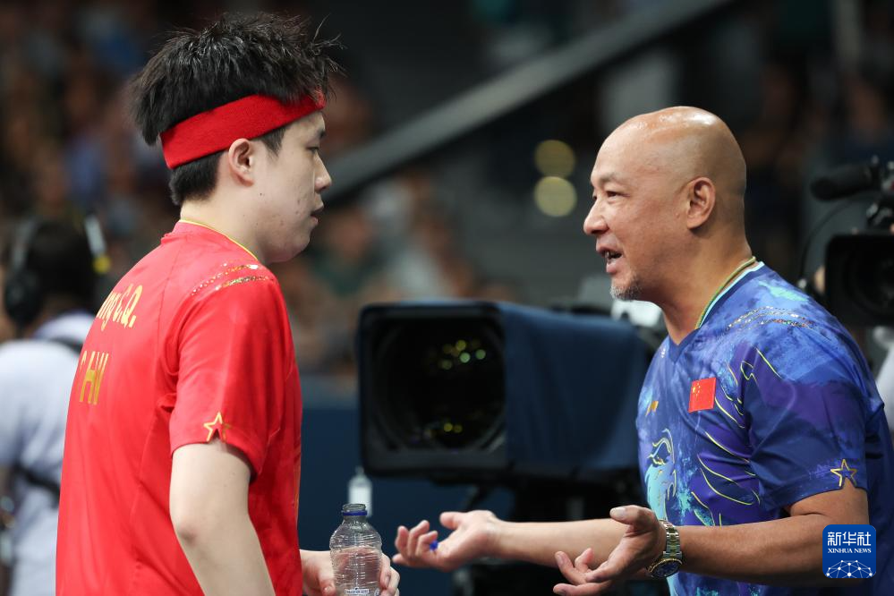 7月28日,王楚钦(左)在比赛间隙接受教练肖战的指导。新华社记者 刘续 摄