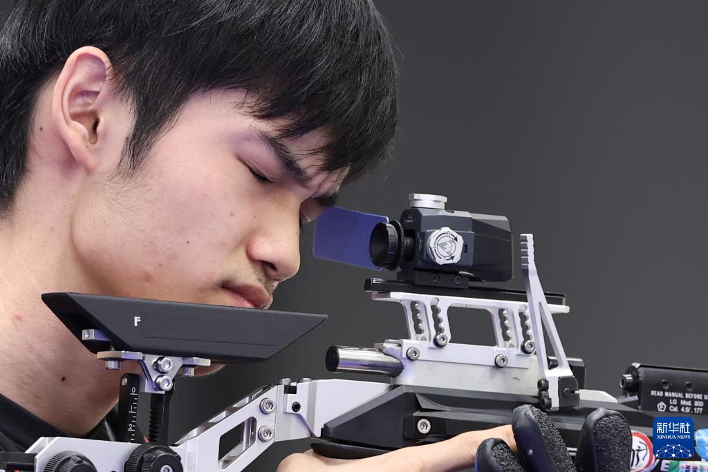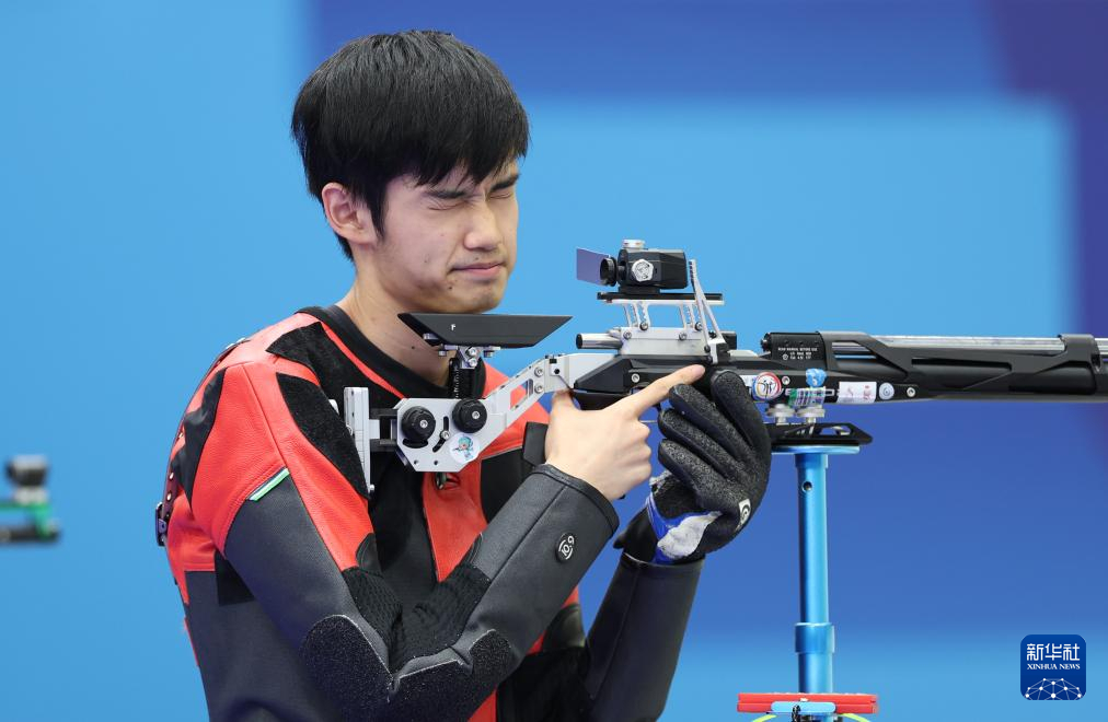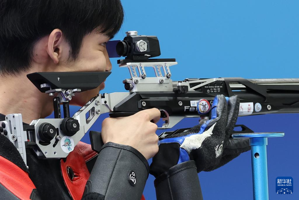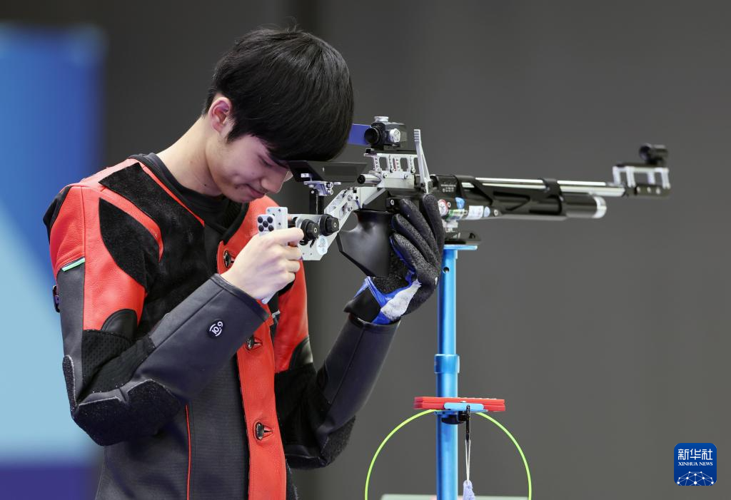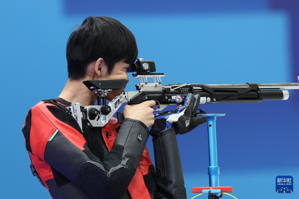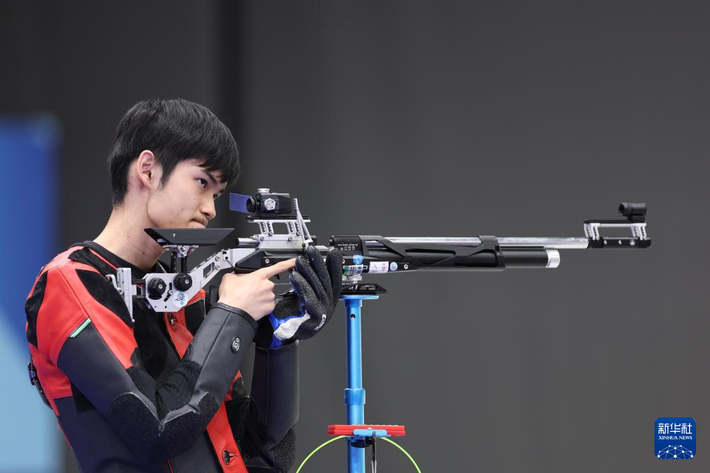 7月29日,盛李豪在比赛中。当日,在法国沙托鲁举行的巴黎奥运会射击男子10米气步枪决赛中,中国选手盛李豪获得冠军。新华社记者 赵丁喆 摄
